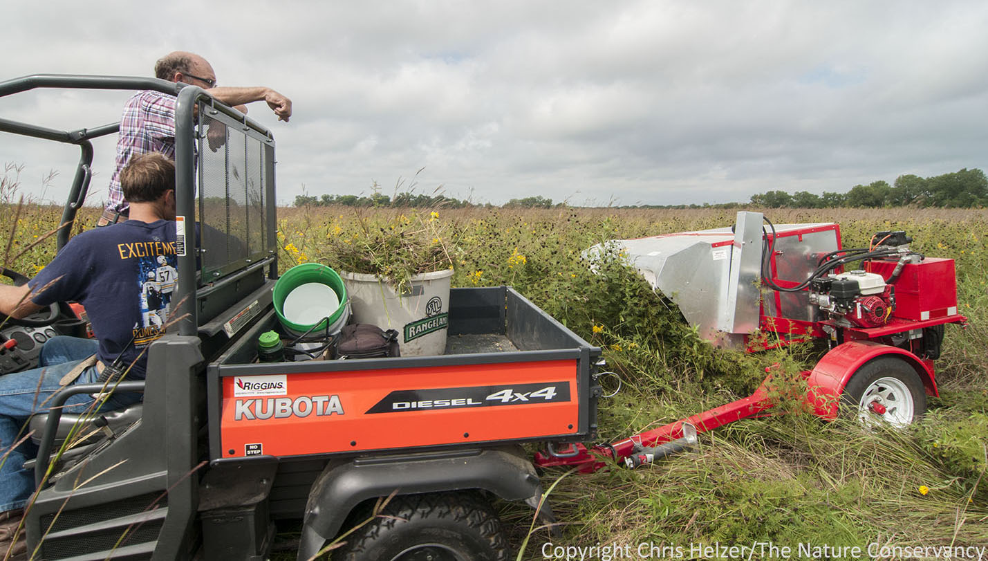 Nelson and Ned watch the new stripper as it harvests seed from Illinois bundleflower. The machine is offset from the UTV so the UTV doesn’t smash the vegetation down before it is harvested.