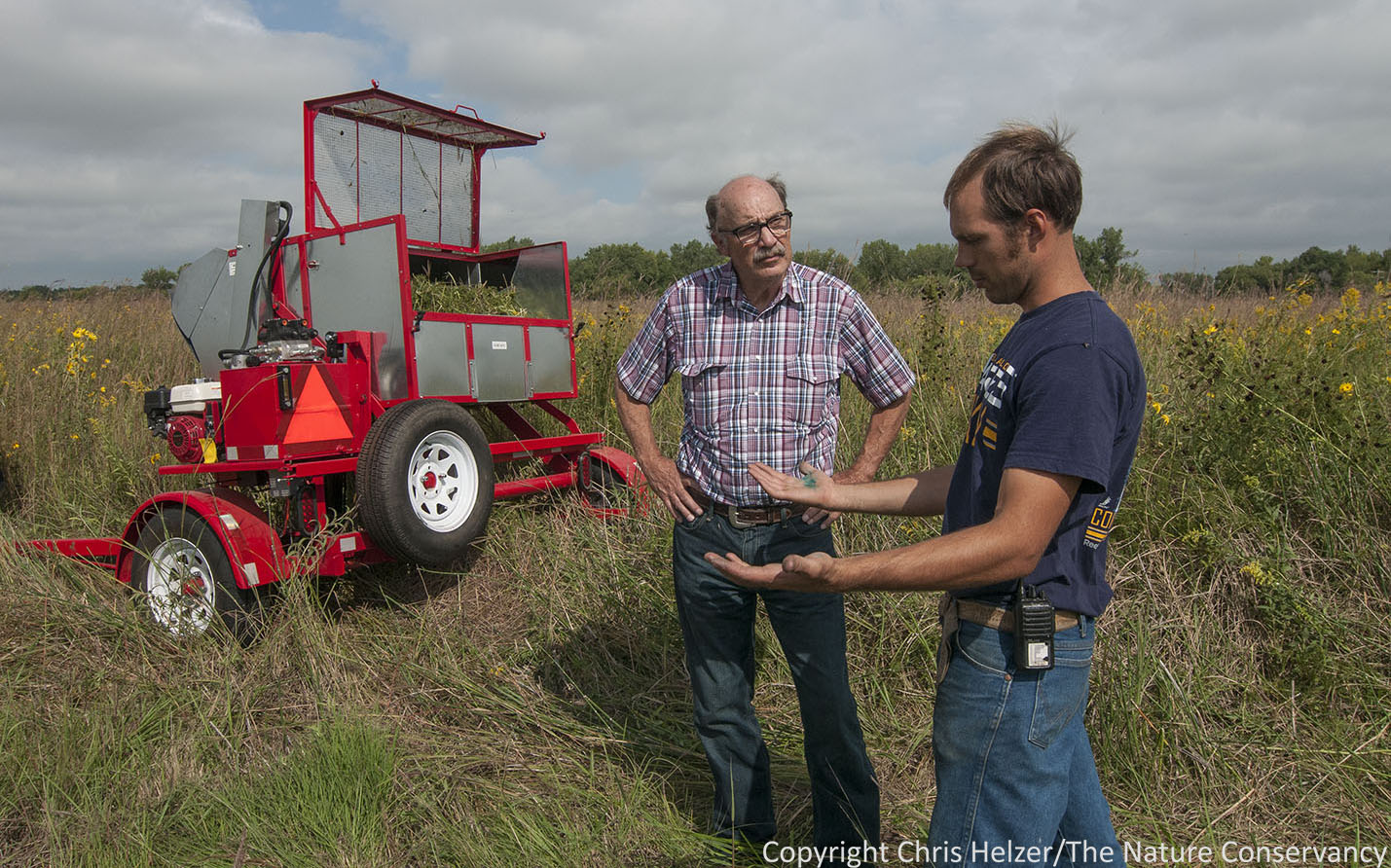 Here, Nelson is harvesting grass seed with a mechanical seed stripper borrowed from Prairie Plains Resource Institute.