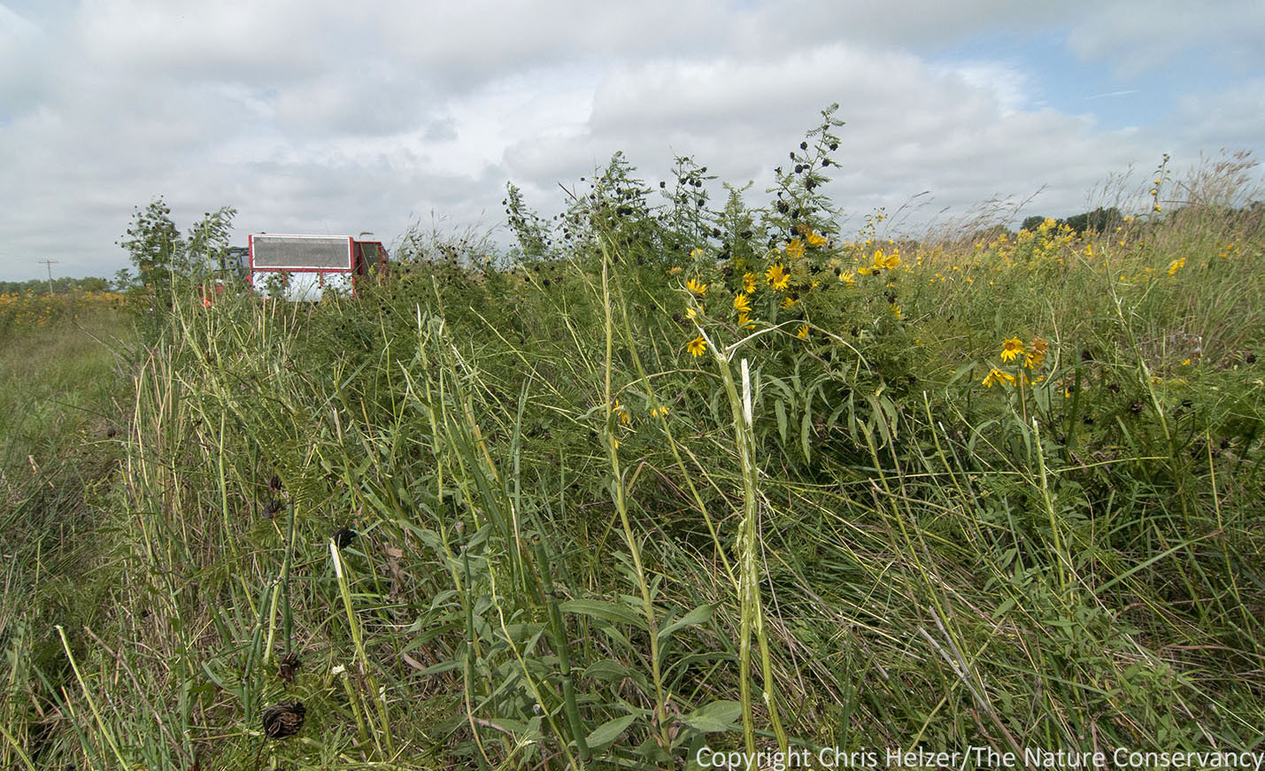 Seed harvest is a big part of our work here at the Platte River Prairies. We don’t do as much complete restoration (converting cropland to high-diversity prairie) as we used to because we’ve just about run out of land to restore. Instead we’ve shifted most of our seed work toward overseeding degraded remnant prairies that are missing many prominent wildflower species. As a result, instead of harvesting from 230 plant species a year, we’re mainly focusing on getting as much seed as possible from about 30 to 40 species.