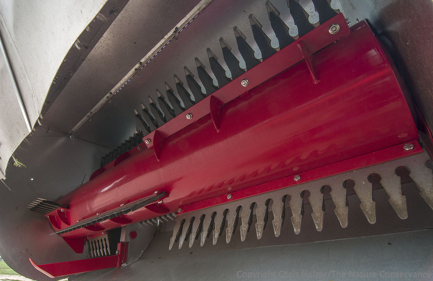 When Ned delivered the machine to us, he had a big grin on his face – a sure sign that he’d come up with something for our tough-to-harvest seed problem. His solution was to replace the harvester’s brush with a more aggressive tool that included “stripping elements” – metal fingers, essentially – made by the Shelbourne Reynolds company. (Shelbourne Reynolds sells an attachment for combines that strips, rather than cuts, the grain from crops such as wheat and rice.) Ned adapted their design for use in his pull-behind seed stripper and he was dying to know whether it would actually work. Just to be safe, he designed the machine so that we could easily remove his experimental portion and replace it with a tried-and-true brush if we wanted to.