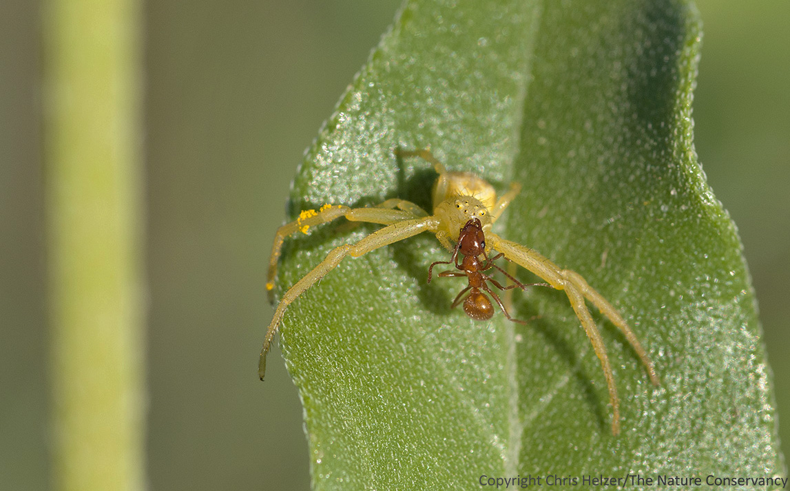 Last summer, I wrote a post about annual sunflowers, including a short bit about how sunflowers secrete extra-floral nectar to attract ants. The ants eat the sweet substance and may help repel potential herbivores from the sunflower in return. As you might expect, however, an abundance of ants can also be a potential source of food for other predators – including crab spiders. When I was at our Niobrara Valley Preserve last week, I noticed several instances where crab spiders were hanging around on sunflowers. They probably weren’t waiting specifically for ants, but apparently ants are an acceptable prey item if they happen to be available (see below).