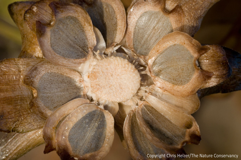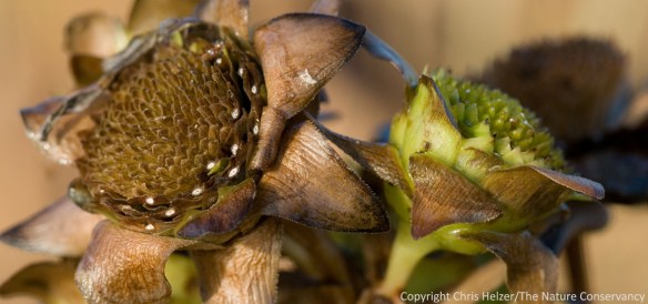 Rosinweed seeds are built differently than sunflower seeds as well. Everyone is familiar with the kind of sunflower seeds sold as snacks – with a two-part shell covering the “meat” of the seed inside. Prairie sunflowers all have variations on that same structure. Silphiums, however, produce very large seeds that are encased in a kind of papery sheath about the size and shape of a fingernail. The photo below shows another rosinweed head on which the seeds are exposed.