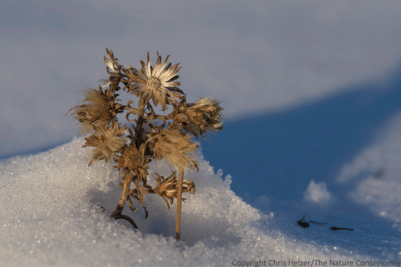 Third, here is this week’s photo. I went to a nearby frozen wetland yesterday, looking for photo opportunities. I wasn’t finding much of interest until I started looking at the edges of where snow had melted away from protruding plants. There, I found some interesting patterns among the ice crystals, often with dark shadows beneath them. This was my favorite shot of the day. I think I see Bambi the fawn (left side, facing to the right). What do you see?