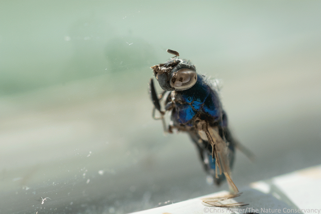 A fly carcass left by the jumping spider in our dining room window.Here’s the little jumper hiding in the corner of the window while I tried to act like I wasn’t interested in photographing it.