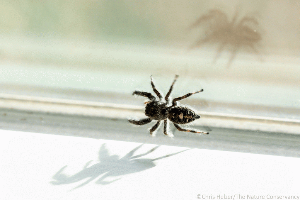 Our family favorites are the jumping spiders. I’m a fan of them for lots of reasons, starting with their big eyes and (often) fuzzy teddy bear bodies. In addition, they’re just mesmerizing to watch. Unlike web weaving spiders, jumpers roam around in search of prey, so they put on a good show. The one currently living with us likes to move between the big south facing windows of our dining room and living room several times a day.