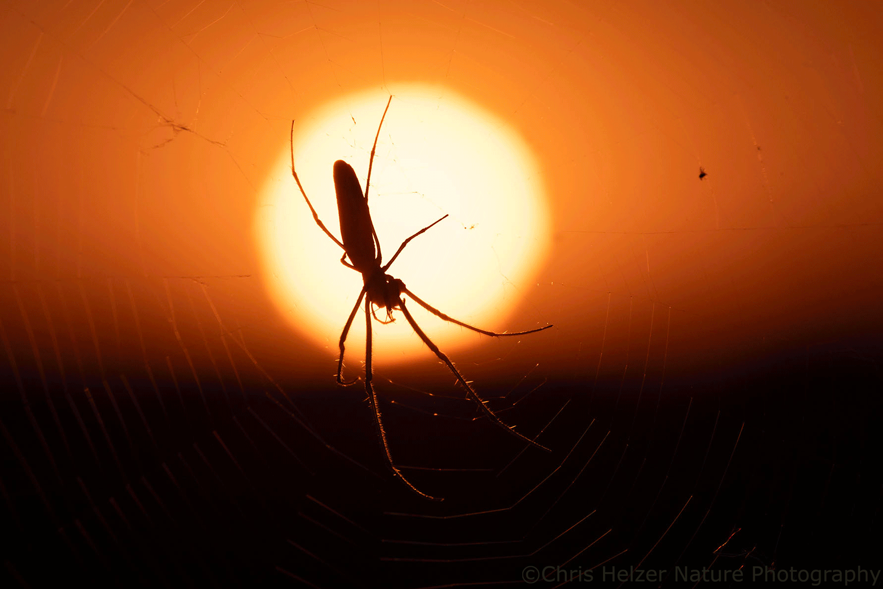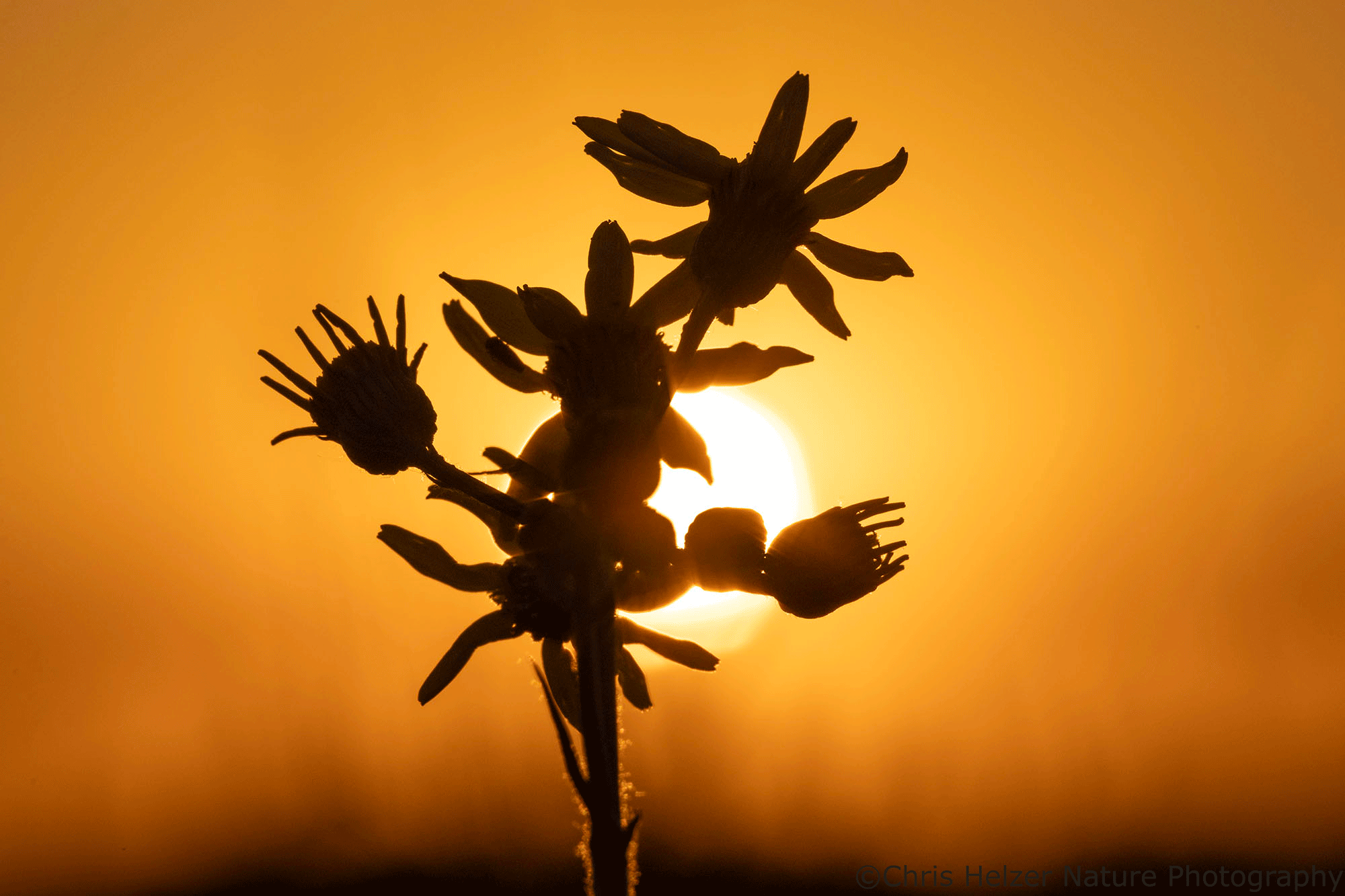 Prairie ragwort (Packera plattensis) and the setting sun.Long-jawed orbweaver on its web.