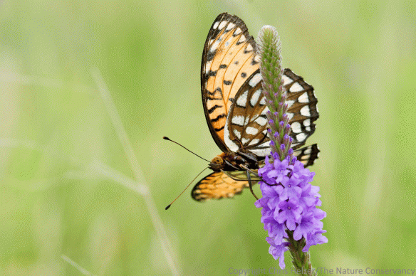 Regal fritillary butterflies are very sensitive to fire, and can be eliminated from isolated prairies if the entire site is burned at an inopportune time. However, populations can also thrive in large prairies managed with a combination of fire and grazing, as long as sufficient unburned areas are available, and many of their favorite nectar plants (like this Verbena stricta) are common, or even weedy.