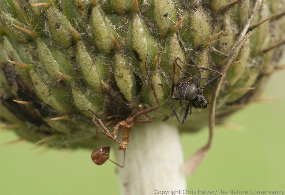 One interesting part of the study was that of the 331 insects they found trapped on the bracts of Flodman’s thistle at Frenchman’s Bluff in Minnesota, 96% were ants. (Given that result, I’m not sure why they focused on seed predation – I don’t think ants feed much on thistle seeds?) I have been trying to keep track of what insect species I see stuck to thistle bracts during the last few years, and while ants do make up the majority of dead insects found there, a number of other species show up as well.