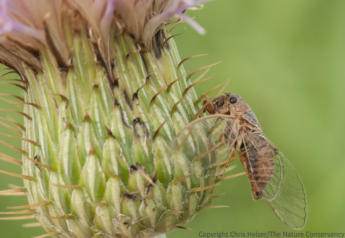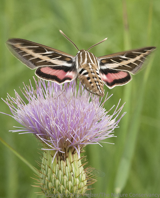 Sphinx moths and many other pollinators feed on the tops of on wavy-leaf thistle flower. It’s the underside that’s dangerous. If you look closely at the bottom of the thistle flower, you can see a couple wings…