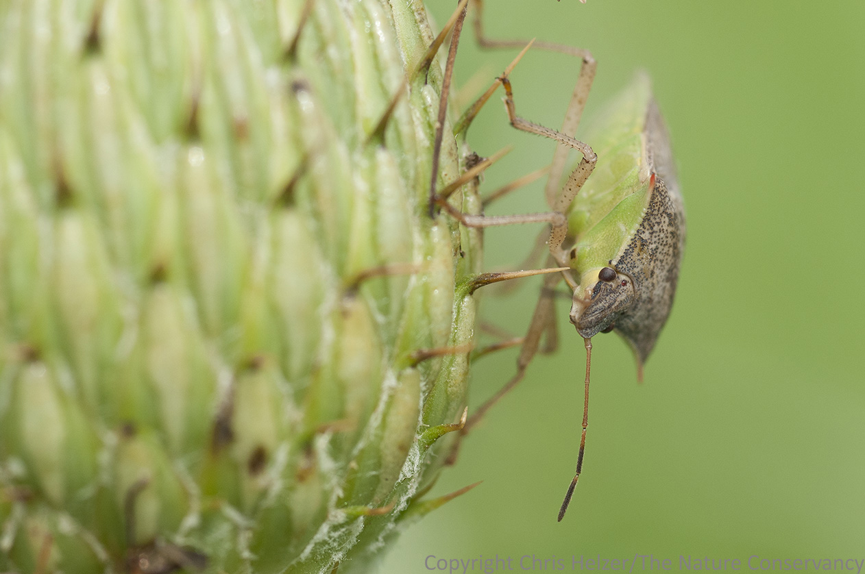 Stink bugs and crab spiders are among the insects that are apparently unaffected by the sticky thistle bracts. This stink bug was moving around the flower with no apparent problems.