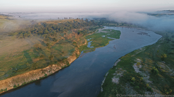 This image looks south. It shows where the northern portion of the Nebraska Sandhills (a 12 million acre grassland landscape) terminates at the wooded breaks of the Niobrara River. The woodland shown here went through the big 2012 wildfire, but many of the trees were protected from fire by the cool, moist north-facing slopes. Those same factors help support tree species (including paper birch) that don’t otherwise seem like they have any right to be in the hot and arid west. Many of the trees in the upper reaches of the draws are bur oaks, along with a few ponderosa pine and eastern red cedar trees that survived the big fire.