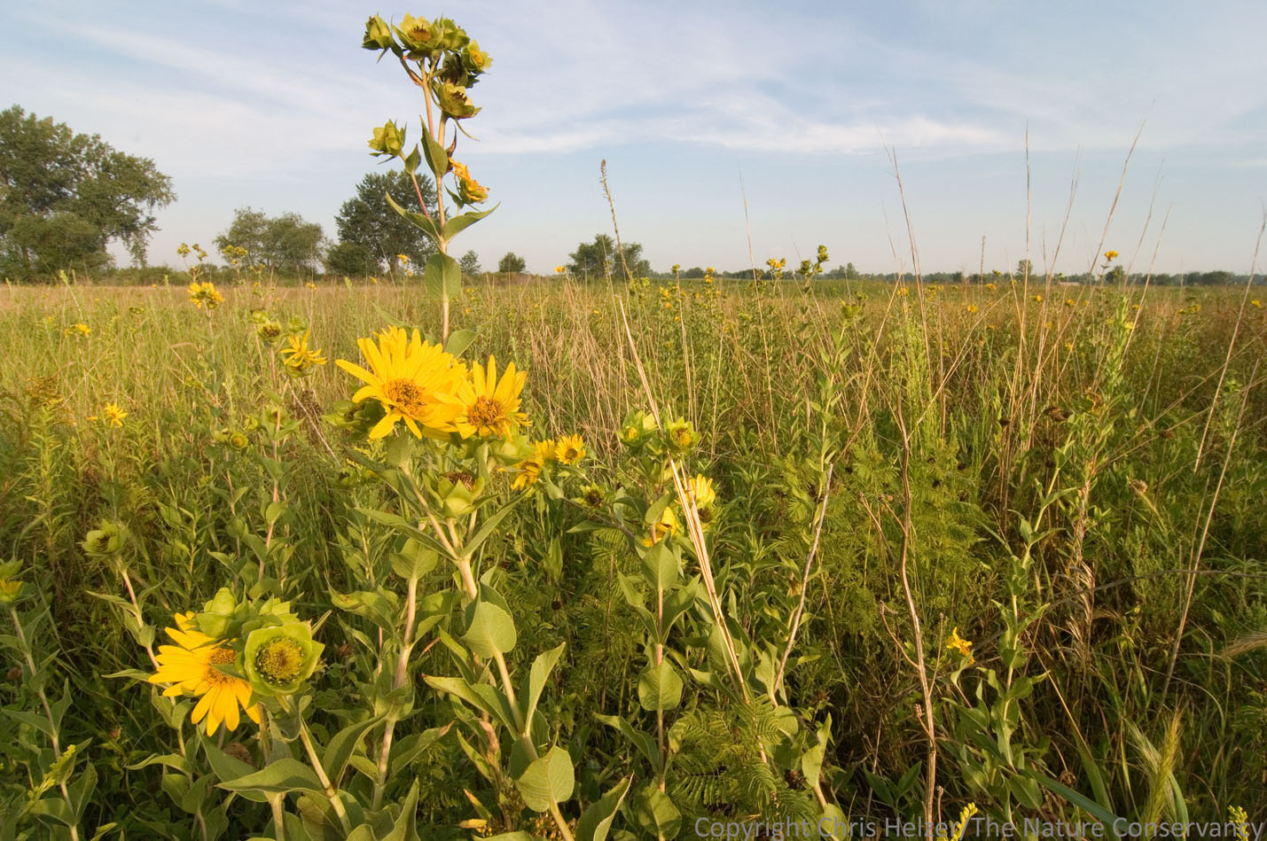 The second example we visited was one of the first seedings done at Kankakee Sands (in the late 1990’s). From the beginning, the several hundred acre prairie has been dominated by grasses and has been low on forb species diversity. For the last several years, the Conservancy has been experimenting with patch-burn grazing as a way to create more heterogenous vegetation structure and to increase forb diversity in this prairie. To date, forb diversity has neither increased nor decreased, but habitat structure has certainly changed. The recently burned (and thus currently grazed) portions of the prairie provided excellent grasshopper sparrow habitat, while other portions were more tall and rank. Though no change has been detected in forb abundance or diversity, the staff has noticed that a few forb species seem to bloom less abundantly than in the past – including compass plant, prairie dock, and Canada milkvetch. Because of that, we discussed the value of fencing out a significant portion of the prairie each year to ensure that those species were given a complete break from grazing pressure periodically.