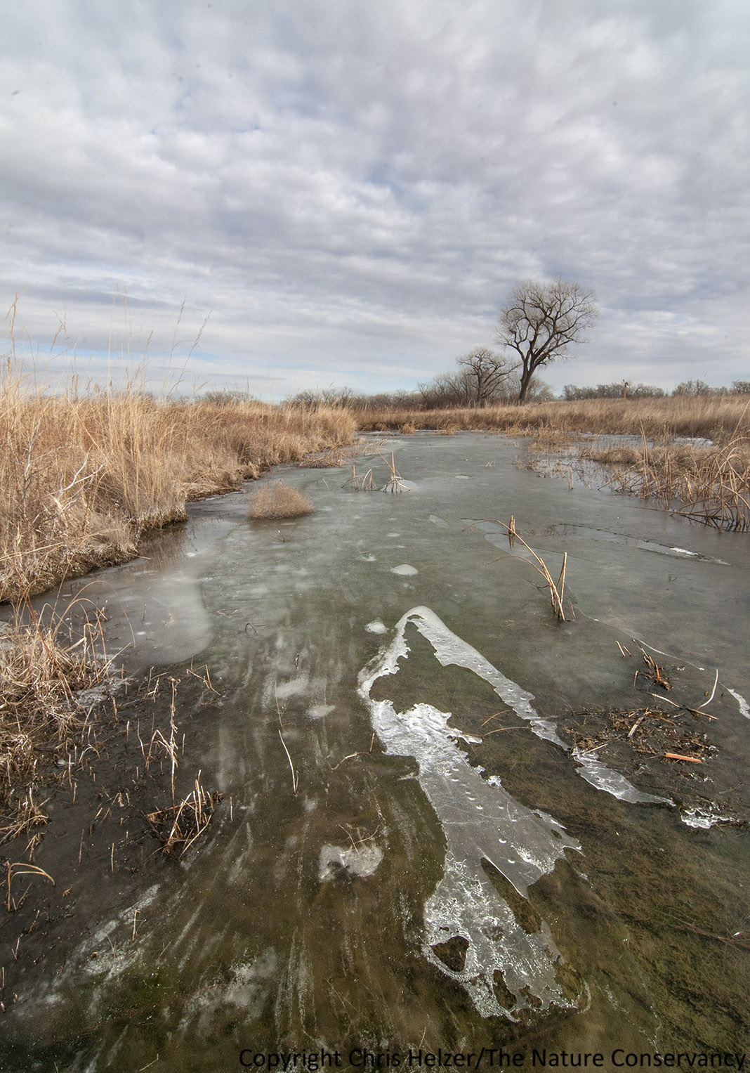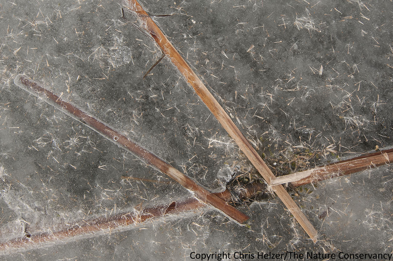I assume the gap near the bases of these cattails was formed either by wind or by the relative warmth of the cattail stems, but I can’t explain the mounded ice.