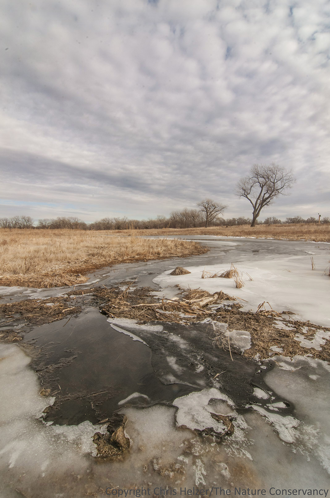 An ice ridge formed along the edge of a flowing channel prior to the most recent cold spell. It apparently caught blowing snow during last weekend’s flurries.