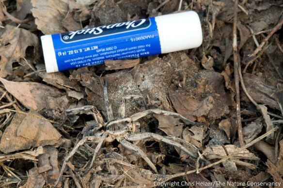 Anyway, during lunch on one of the days, Jan Whitney from Prairie Plains Resource Institute found a gigantic wolf spider on the ground, and I scooped it up and put it in a ziplock bag to show the kids. It was the biggest spider I’ve ever seen in Nebraska, and the kids were duly impressed. At the end of the day, I took the spider home to get some photos of it before releasing it.