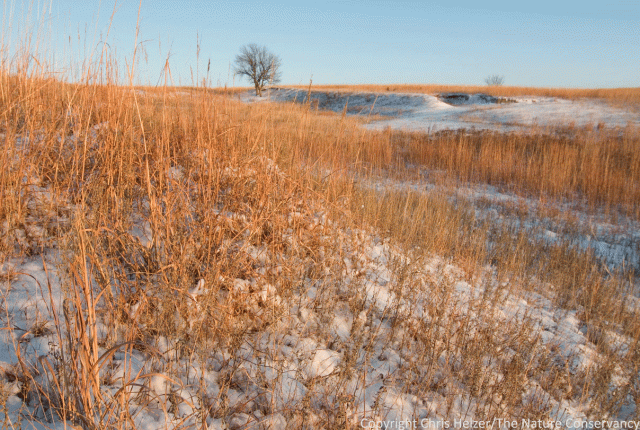 Last week, I saw a couple interesting things in nearby snow-covered prairies. The first is something I’ve seen often before, which is evidence of the importance of western ragweed as a winter food. Ragweed plants sticking up above the snow are very commonly surrounded by bird tracks, and I saw lots of that at our family prairie last week.