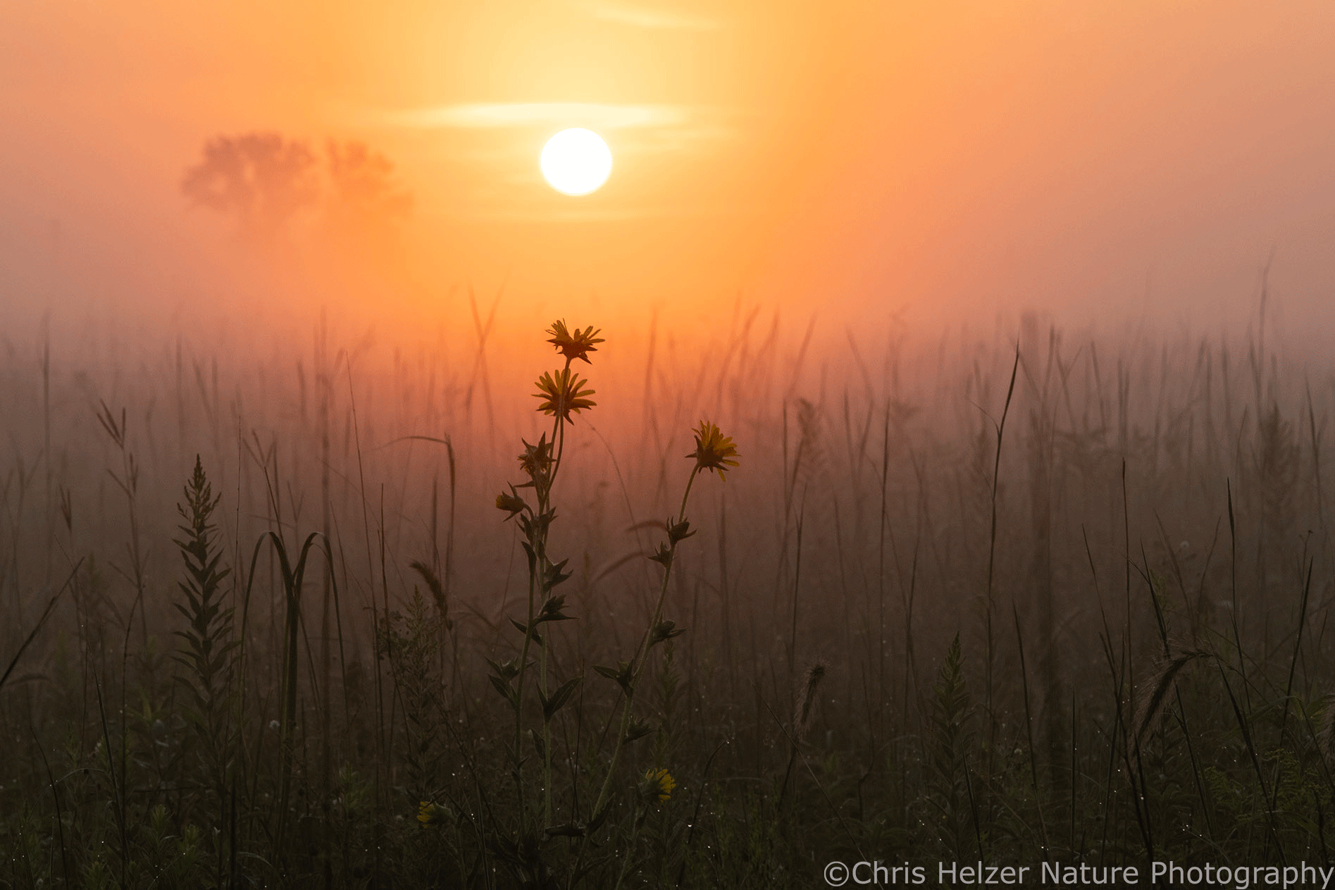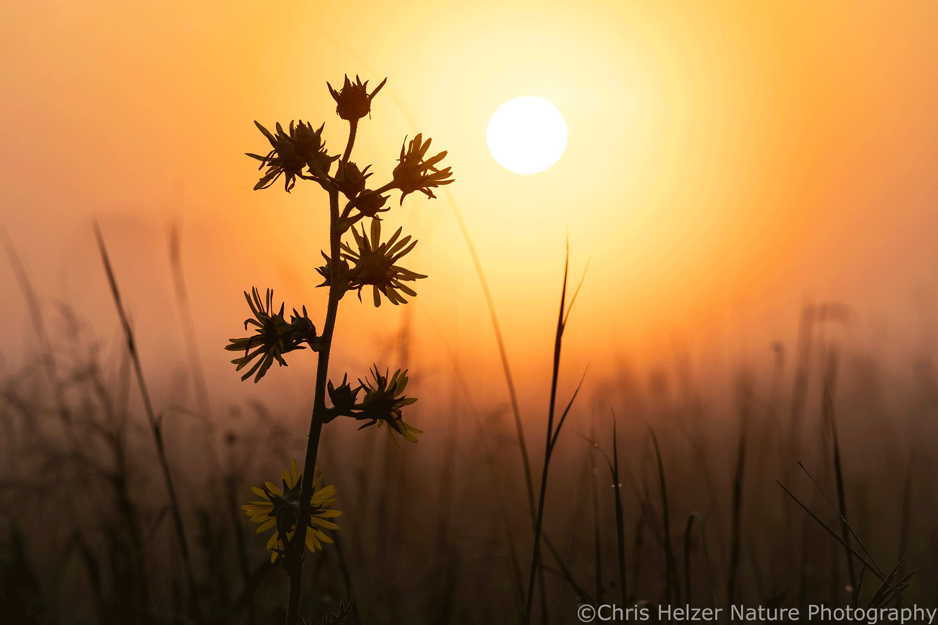 Sunrise on a foggy morning at the Platte River Prairies.Compass plant and sunrise.Canada wildrye with dew and morning light.