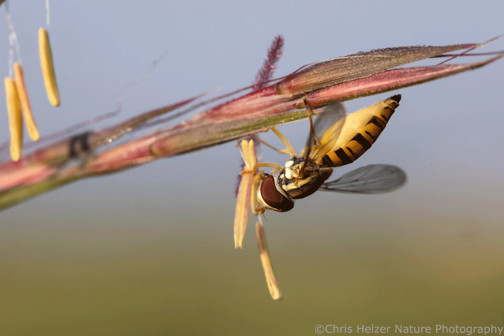 Hover flies are always a common sight on the flowers of grasses (as well as other wildflowers). Grasses are wind-pollinated, so the hover flies probably don’t help the grasses any, but there seems to be plenty of pollen to go around, so I doubt they do any serious harm. Plus, they’re pretty dang cute – especially when they grab anthers in their front legs as they eat.