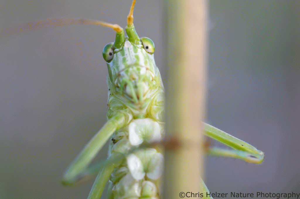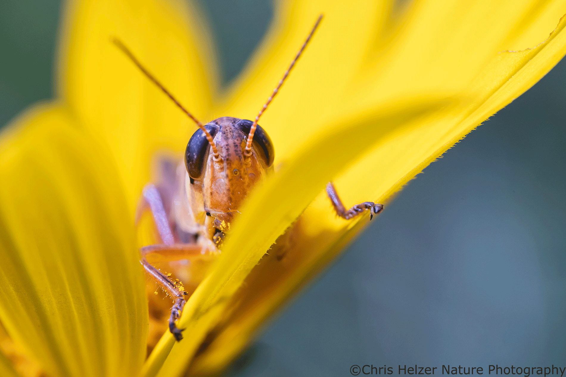 Hover fly feeding on big bluestem pollen.Widow skimmer in the morning.Grasshopper peering at me from a sunflower.