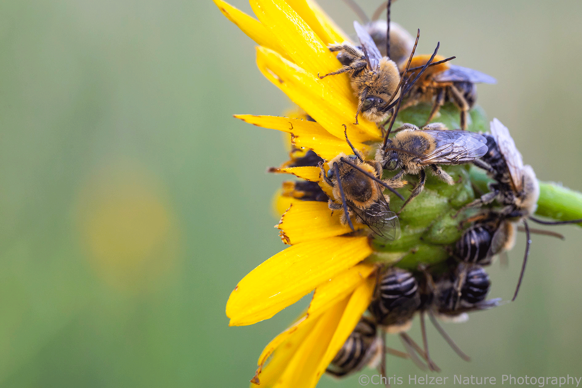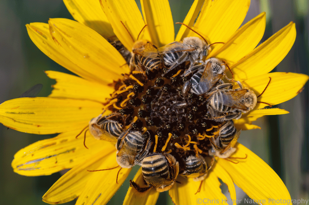 Longhorn bees waking up in the morning on a stiff sunflower (Helianthus pauciflorus).