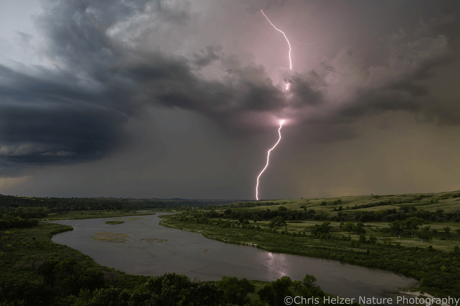 Lightning in Sandhills prairie. Niobrara Valley Preserve.Lightning over the Niobrara River. Niobrara Valley Preserve.