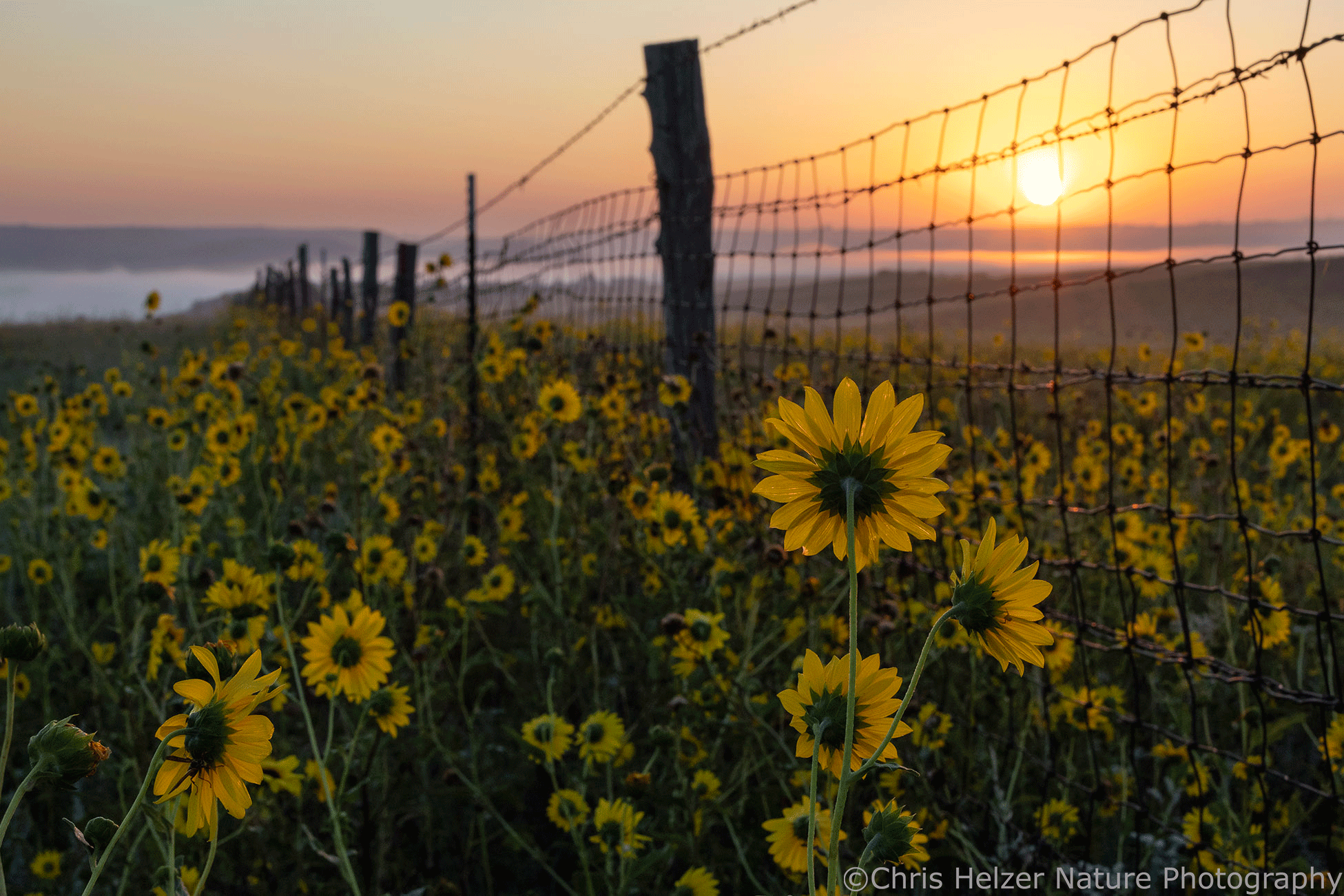 Plains sunflowers (Helianthus petiolaris) and bison fence at sunrise. Niobrara Valley Preserve.Plains sunflower and rising sun.