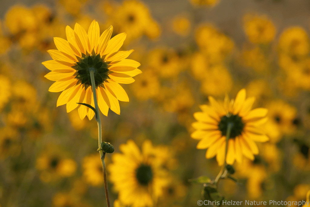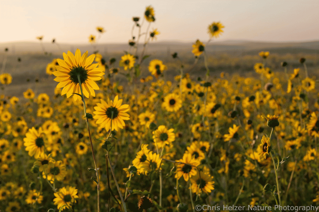 Huge numbers of annual sunflowers usually signifies a temporary drop in the vigor of dominant grasses and other perennial plants – from drought, fire, grazing, or a combination. While those other plants are regathering their strength, sunflowers step up and provide all their abundant resources to the members of the prairie community. Plus, of course, it’s a nice thing for photographers.