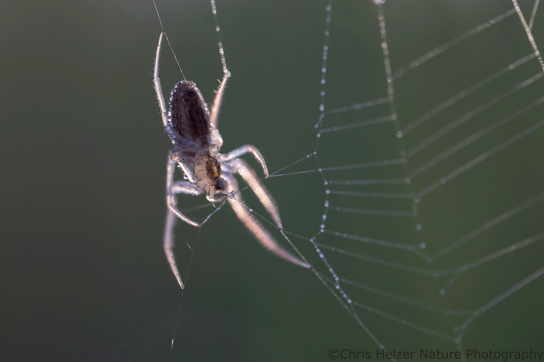 One morning, I spent several minutes watching a small spider deconstruct its web, eating it as it went. Many spider species will re-make their web daily, and eating the old one is a way to gain back some of the nutrients it takes to create more silk. This one was working methodically, pulling threads toward her mouth as she circled the web and spiraled inward.